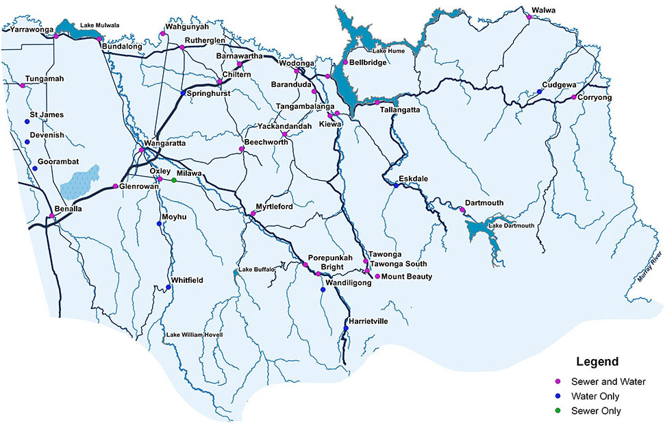 We operate 21 water treatment facilities and 22 wastewater treatment plants that service most towns across the region. Over 200 full time equivalent staff are employed at our centres in Wodonga, Wangaratta, Benalla, Yarrawonga, Corryong, Beechworth, Mount Beauty and Myrtleford.